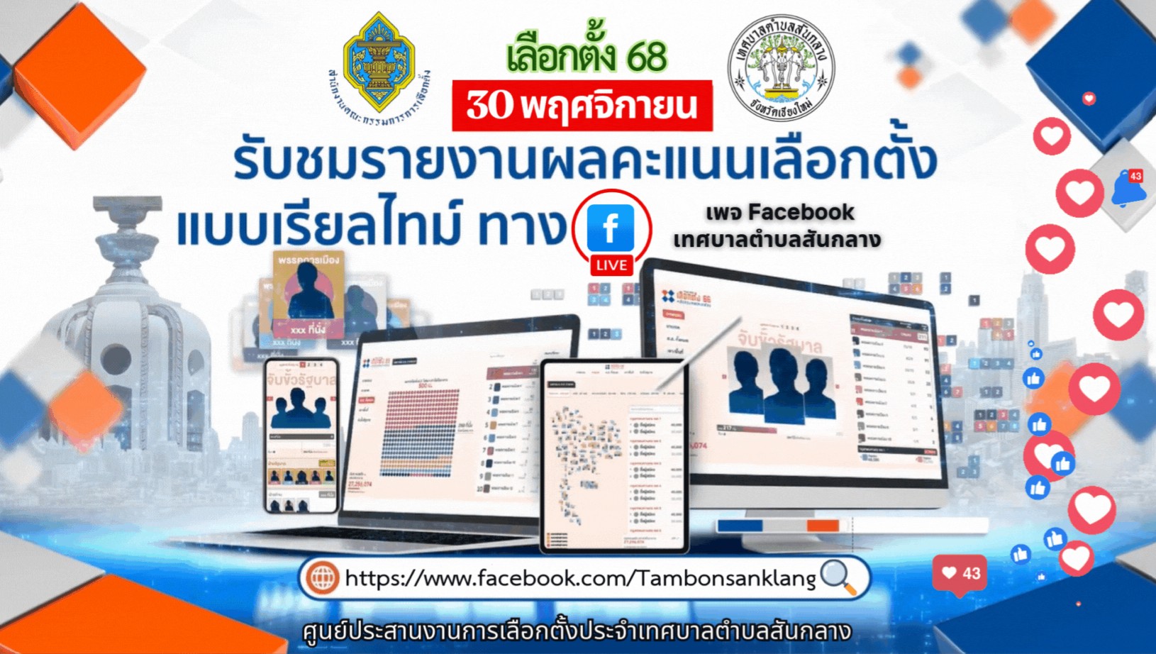 ✅ ขอเชิญรับชมการรายงานผลคะแนนเลือกตั้งนายกเทศมนตรีตำบลสันกลาง และสมาชิกสภาเทศบาลตำบลสันกลาง (เขตเลือกตั้งที่ 2) ในวันที่ 30 พฤศจิกายน 2568 ตั้งแต่เวลาประมาณ 18.00 น. เป็นต้นไป