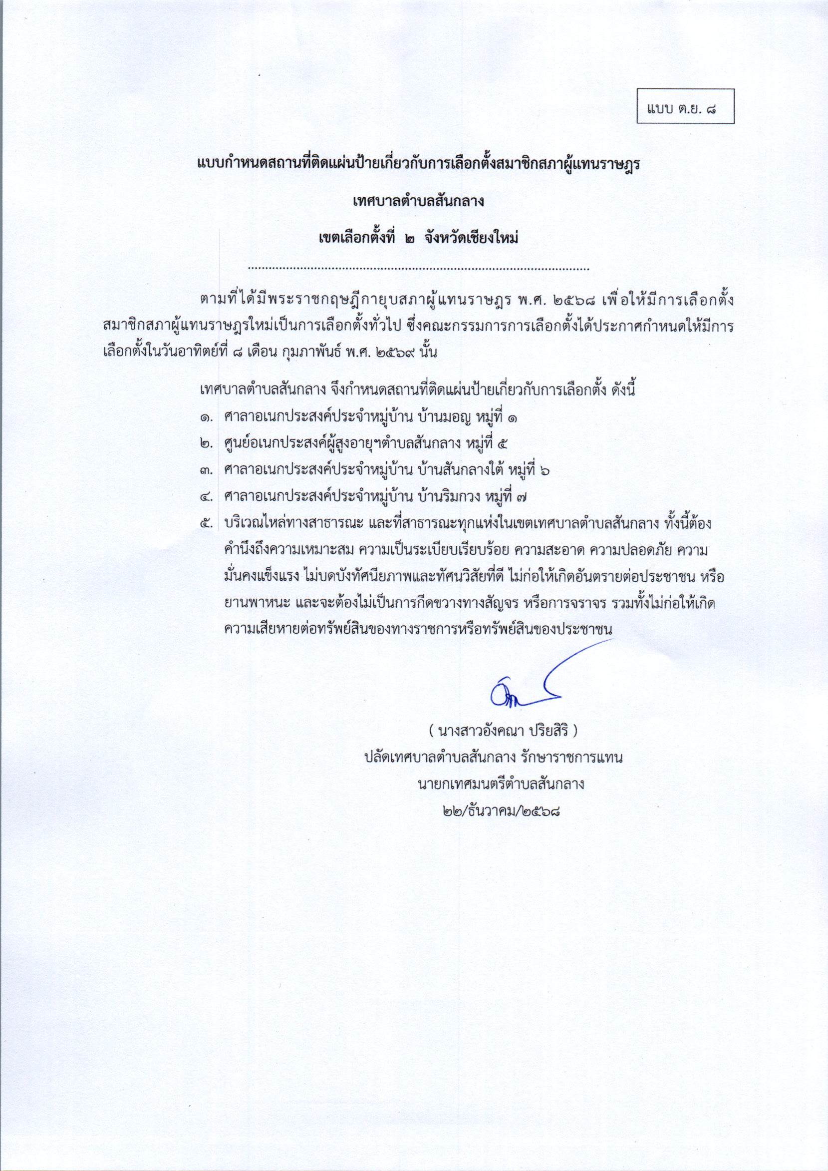 แบบกำหนดสถานที่ติดแผ่นป้ายเกี่ยวกับการเลือกตั้งสมาชิกสภาชิกสภาพนราษฎรเทศบาลตำบลสันกลาง เขตเลือกตั้งที่ ๒ จังหวัดเชียงใหม่