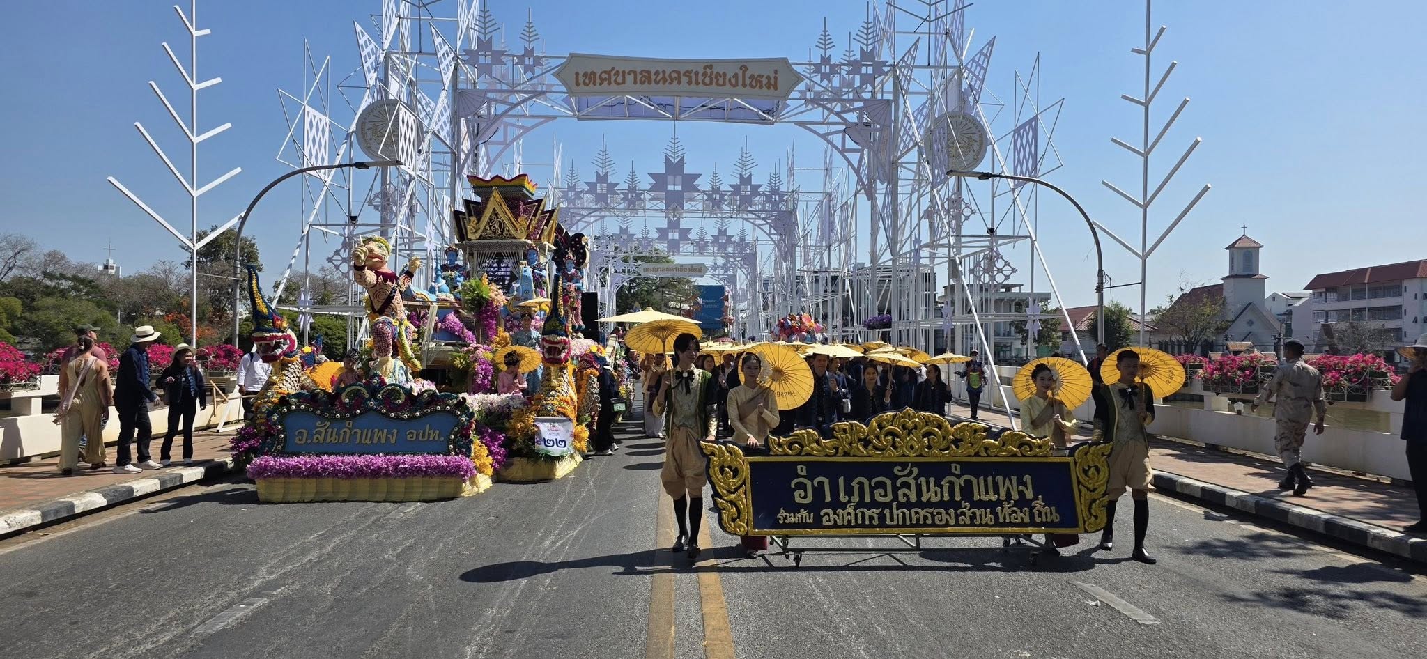 ในปีนี้ รถขบวนรถบุปผชาติอำเภอสันกำแพงอยู่ในลำดับที่ 22 ซึ่งถูกตกแต่งอย่างสวยงามด้วยมวลหมู่ไม้ดอกนานาพรรณ โดยการนำของ นายคเณศ คำนนท์ นายอำเภอสันกำแพง