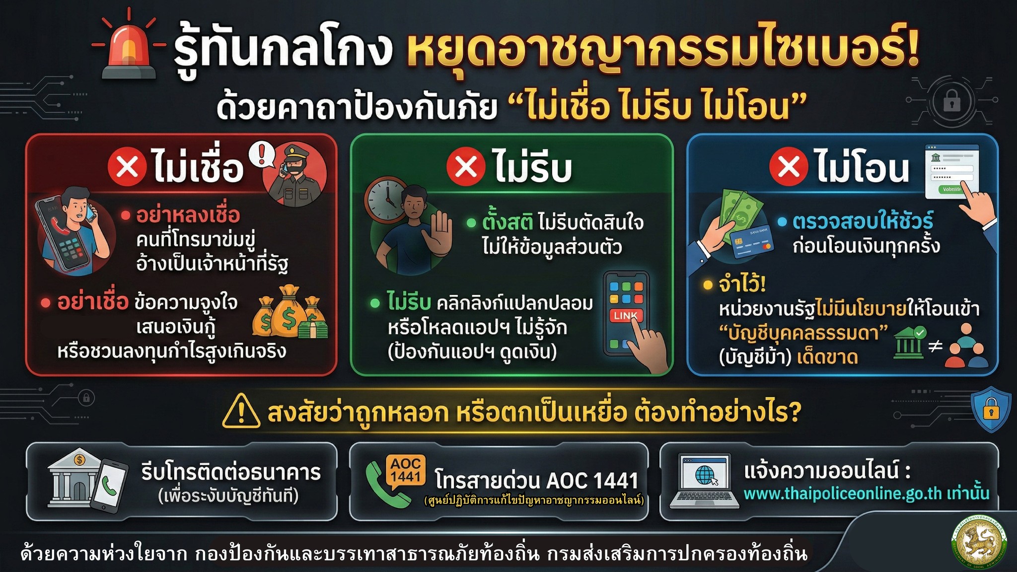 เทศบาลตำบลสักนลาง ขอประชาสัมพันธ์ การสร้างความรู้ความเข้าใจเพื่อป้องกันการหลอกลวง ทางออนไลน์ (Scammer) เป็นการขับเคลื่อนนโยบายรัฐบาลและกระทรวงมหาดไทย การสร้างการรับรู้ให้แก่ประชาชนในการป้องกันปัญหาอาชญากรรมทางไซเบอร์ การพนัน และการหลอกลวงในรูปแบบต่าง ๆ กรมส่งเสริมการปกครองท้องถิ่นได้จัดทำอินโฟกราฟฟิก เพื่อเผยแพร่ความรู้ความเข้าใจเกี่ยวกับรูปแบบมิจฉาชีพพที่พบบ่อยตามแต่ละช่วงวัยและแนวทางป้องกัน "ไม่เชื่อ-ไม่รีบ-ไม่โอน" เพื่อสร้างการรับรู้สร้างภูมิคุ้มกันทางความคิด และความรู้เท่าทันให้แก่ประชาชน