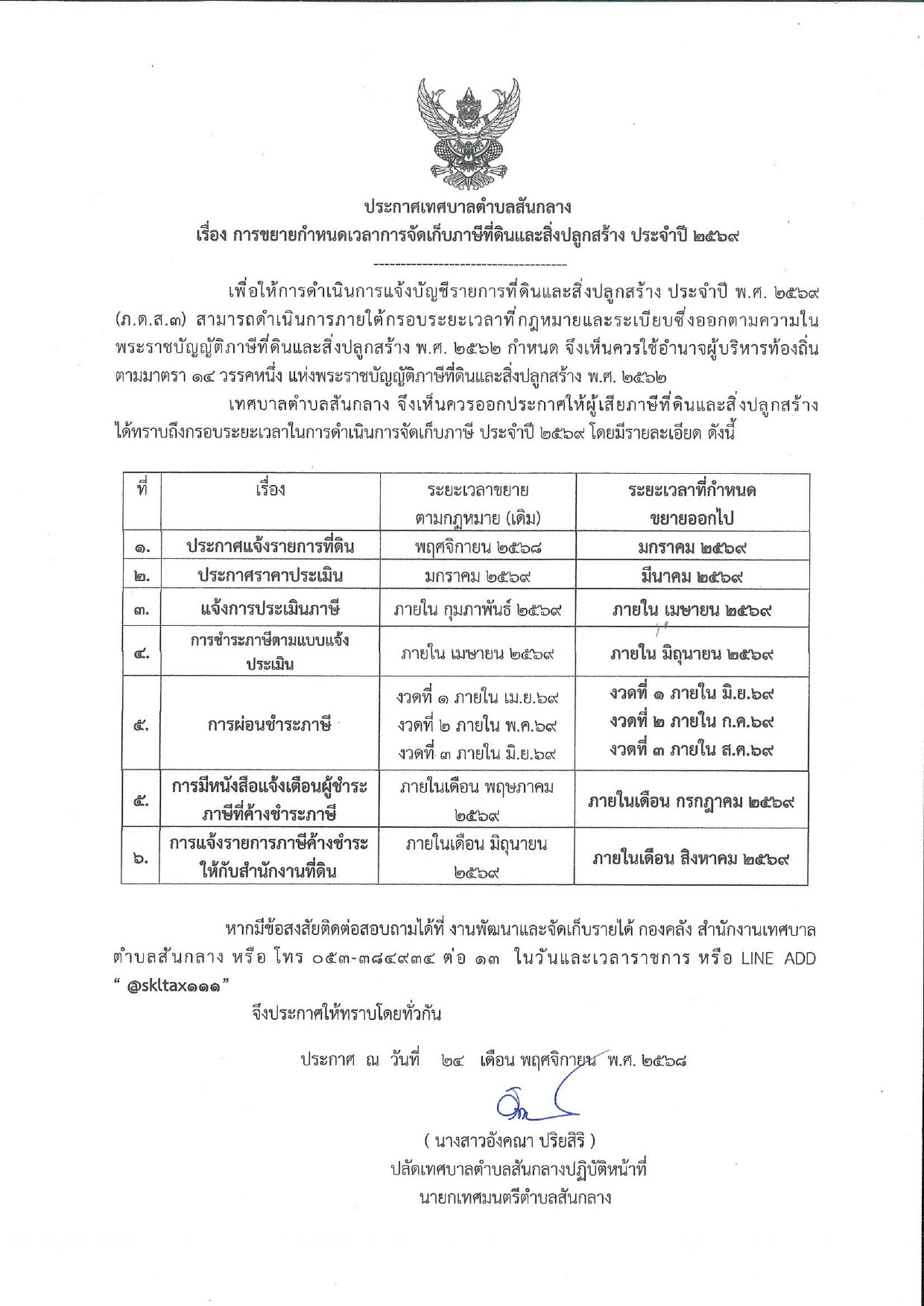 ประชาสัมพันธ์ ประกาศเทศบาลตำบลสันกลาง เรื่อง ขยายระยะเวลาจัดเก็บภาษีที่ดินและสิ่งปลูกสร้างประจำปี 2569