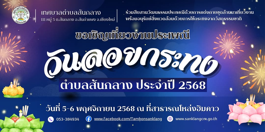 ➡️ เทศบาลตำบลสันกลาง ได้กำหนดจัดงานลอยกระทง ประจำปี 2568 ระหว่างวันที่ 5-6 พฤศจิกายน 2568 ณ บริเวณที่สาธารณโหล่งฮิมคาว หมู่ที่ 2 จึงขอเชิญชวนประชาชนตำบลสันกลาง มาร่วมแอ่วงานลอยกระทงในปีนี้ และขอเชิญชวนร่วมแต่งกายด้วยชุดพื้นเมือง เพื่อสืบสานบรรยากาศแบบล้านนากันนะครับ