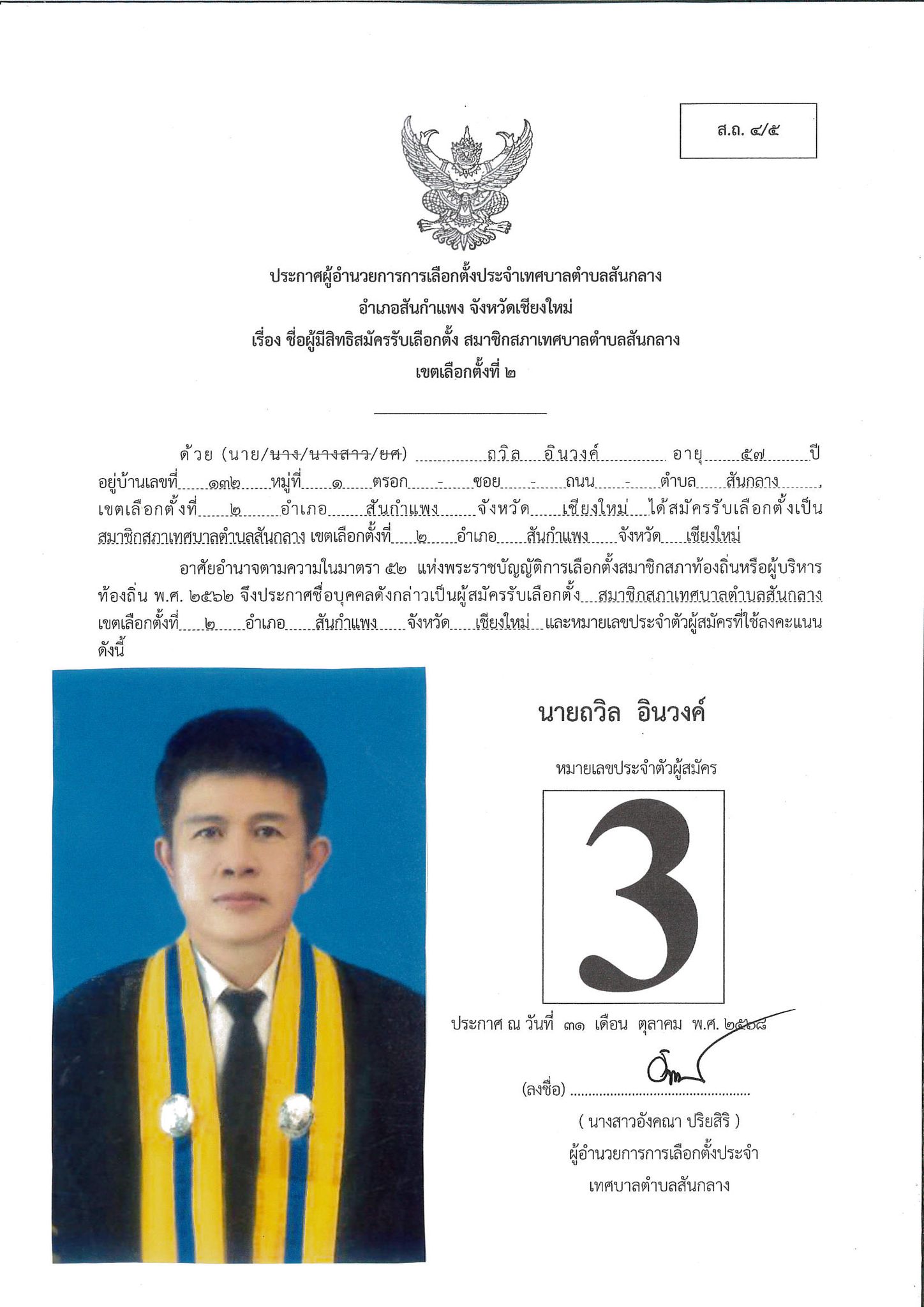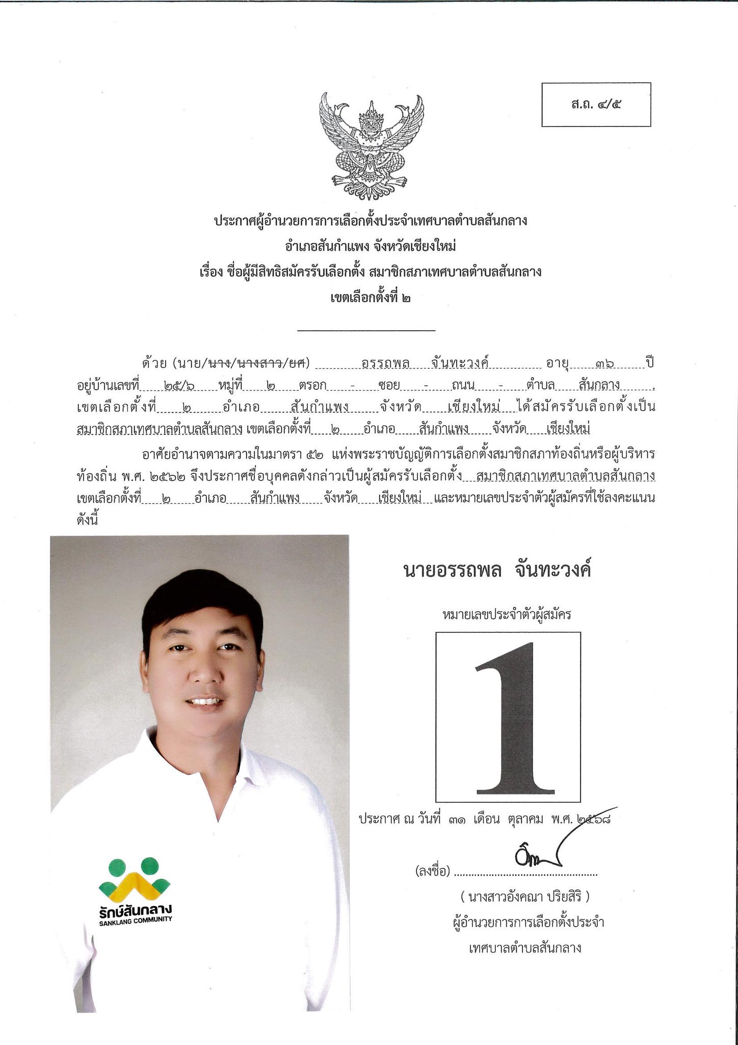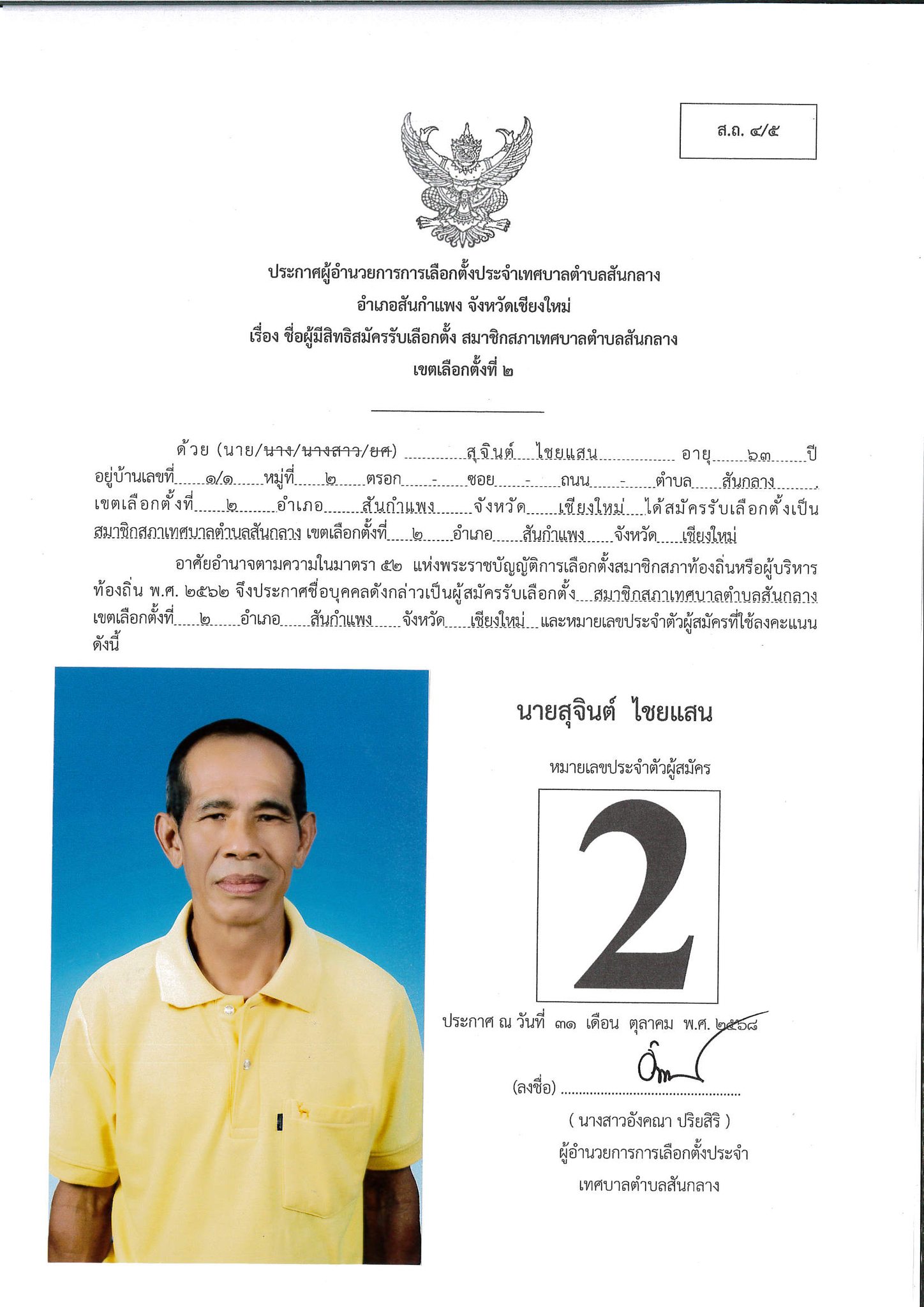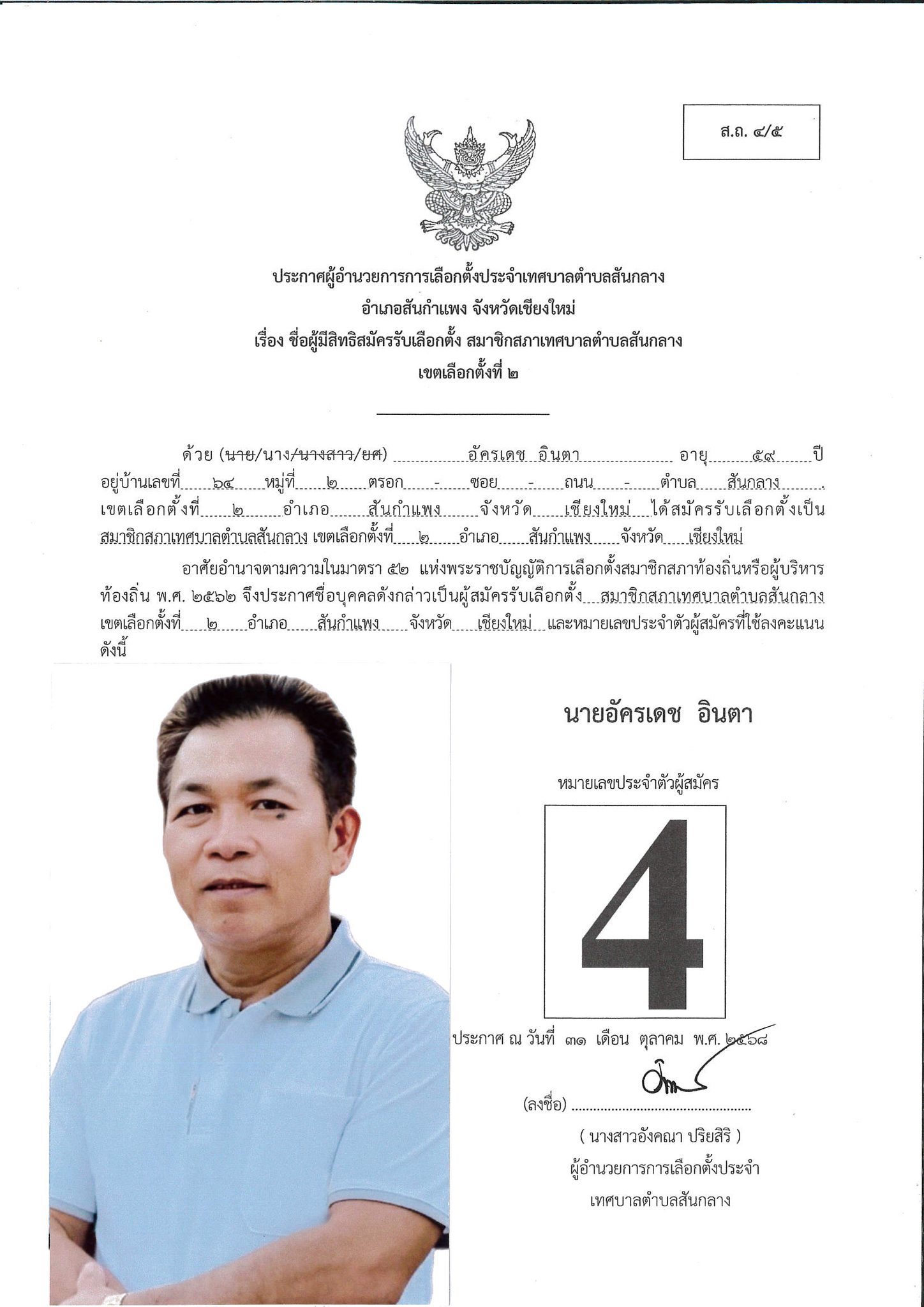 ประกาศผู้อำนวยการการเลือกตั้งประจำเทศบาลตำบลสันกลาง อำเภอสันกำแพง จังหวัดเชียงใหม่ เรื่อง บัญชีรายชื่อผู้สมัครรับเลือกตั้ง สมาชิกสภาเทศบาลตำบลสันกลาง ที่ได้รับสมัครรับเลือกตั้งและไม่ได้รับสมัครรับเลือกตั้ง เขตเลือกตั้งที่ ๒ ประกาศ ณ วันที่ ๓๑ ตุลาคม ๒๕๖๘