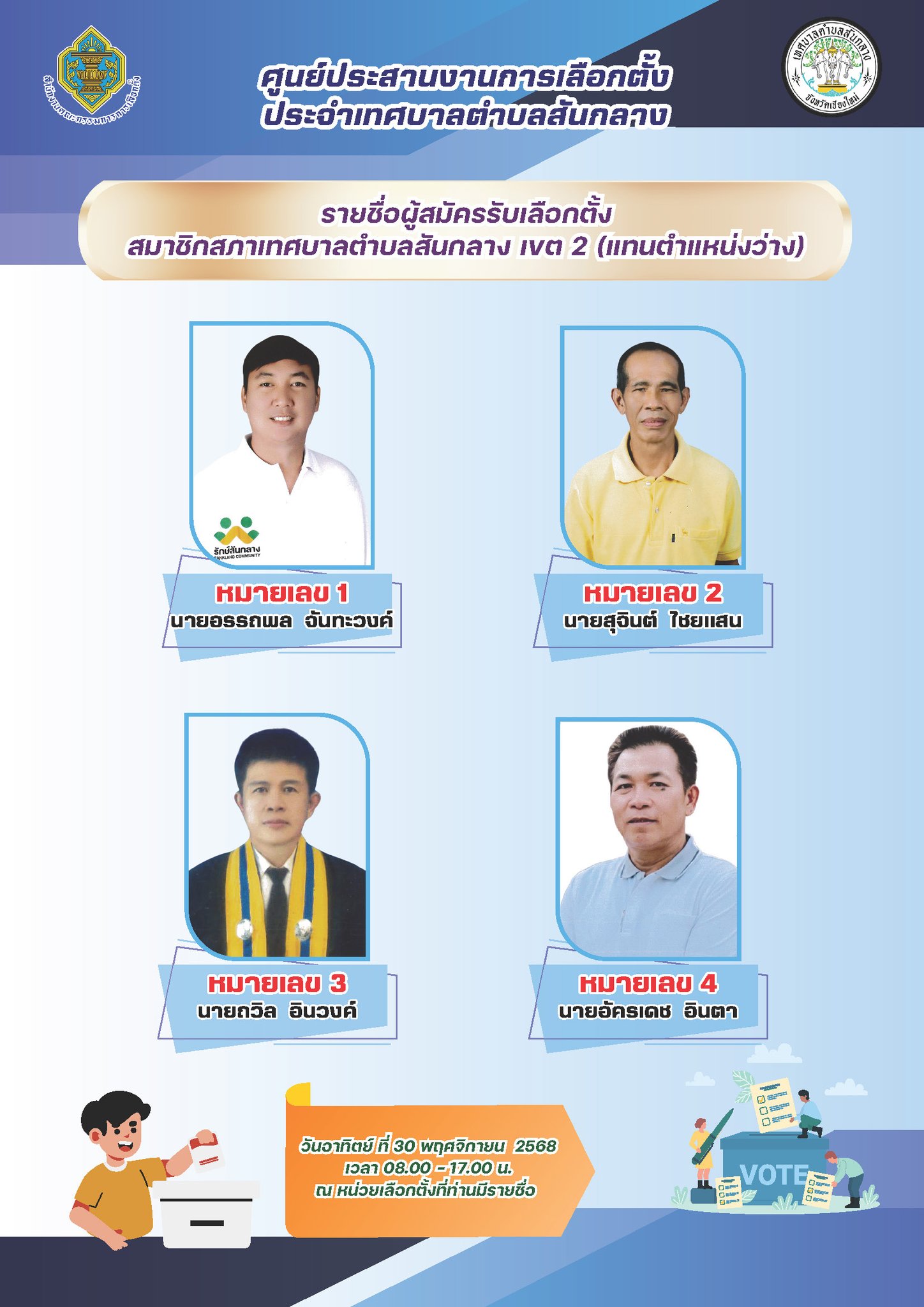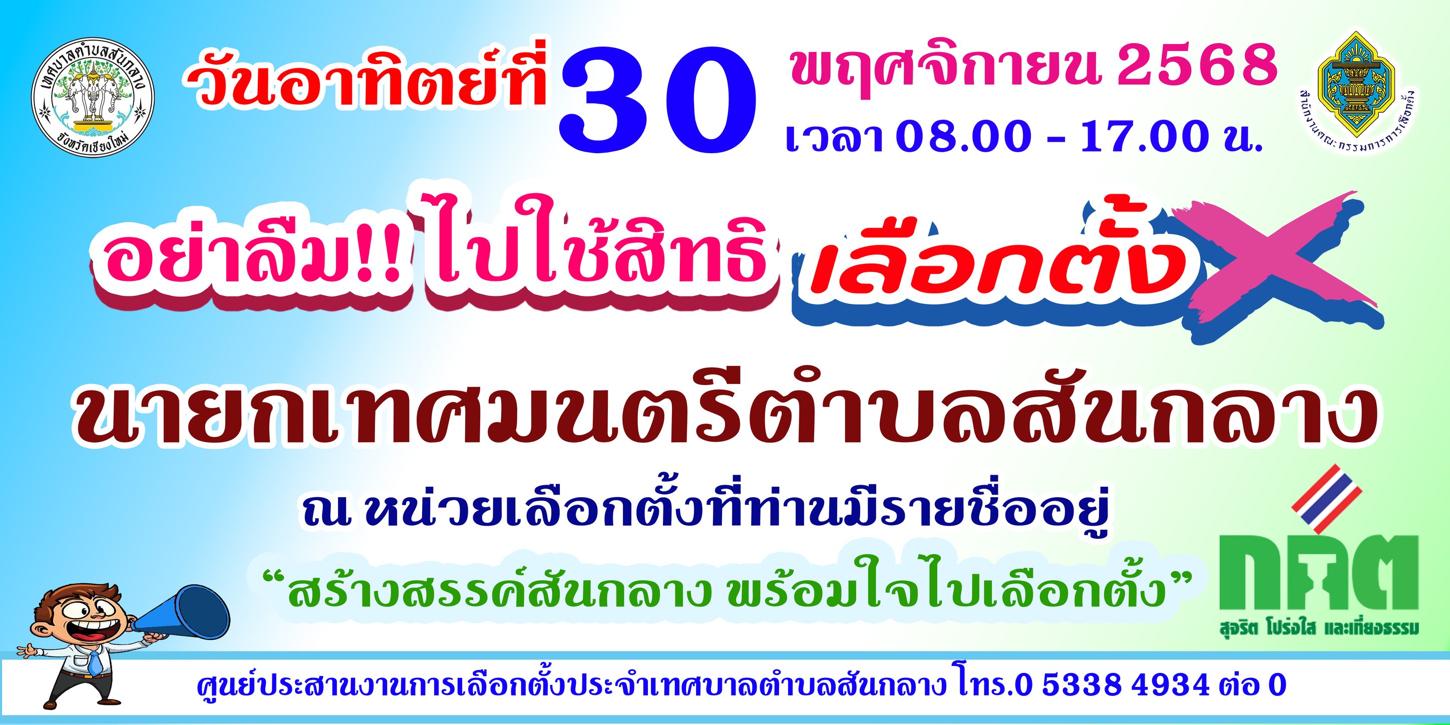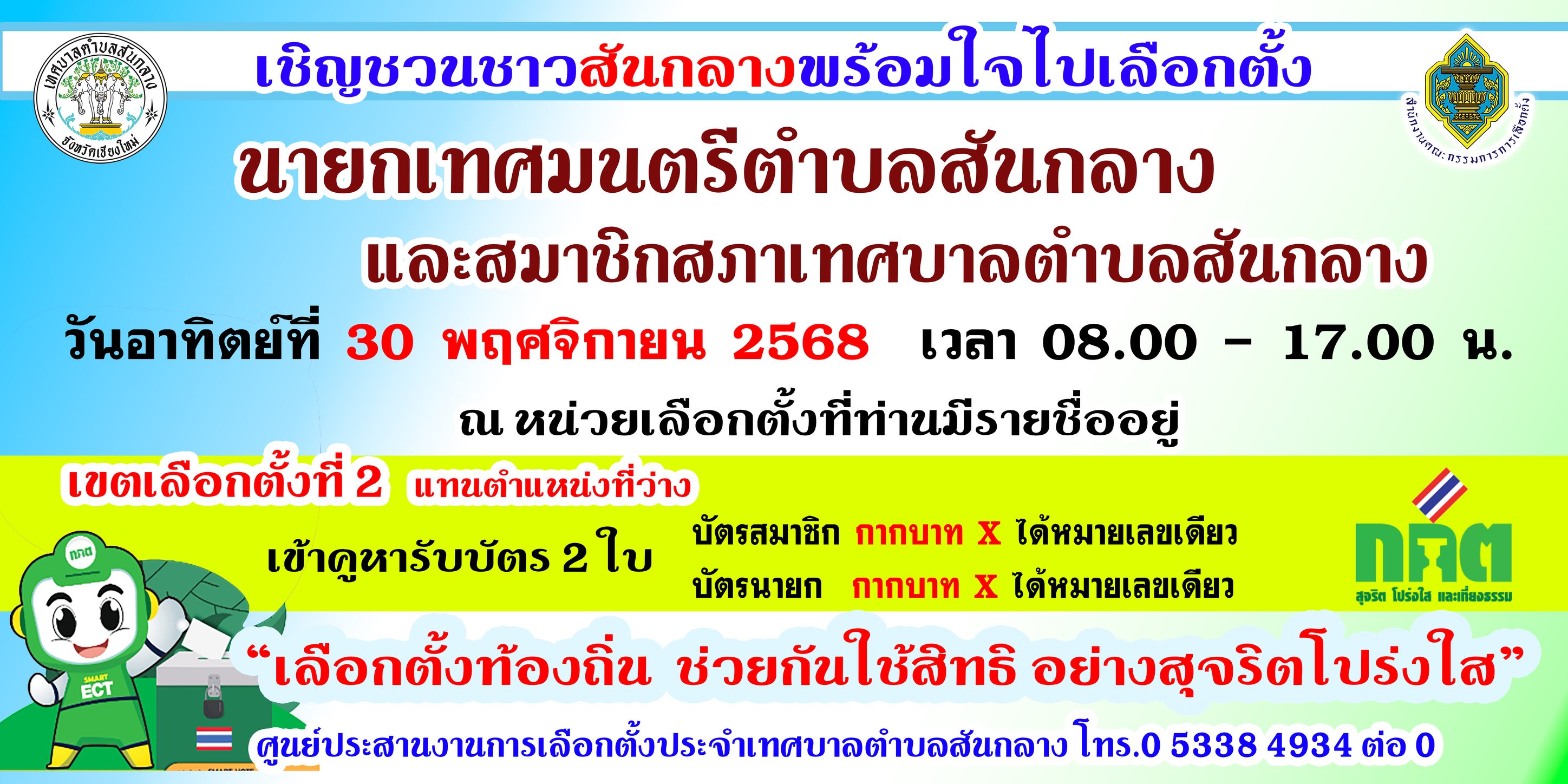 ✨ขอเชิญชวนประชาชนผู้มีสิทธิเลือกตั้ง ใช้สิทธิเลือกตั้งนายกเทศมนตรีตำบลสันกลาง และสมาชิกสภาเทศบาลตำบลสันกลาง เขตเลือกตั้งที่ 2 ในวันที่ 30 พฤศจิกายน พ.ศ. 2568✨